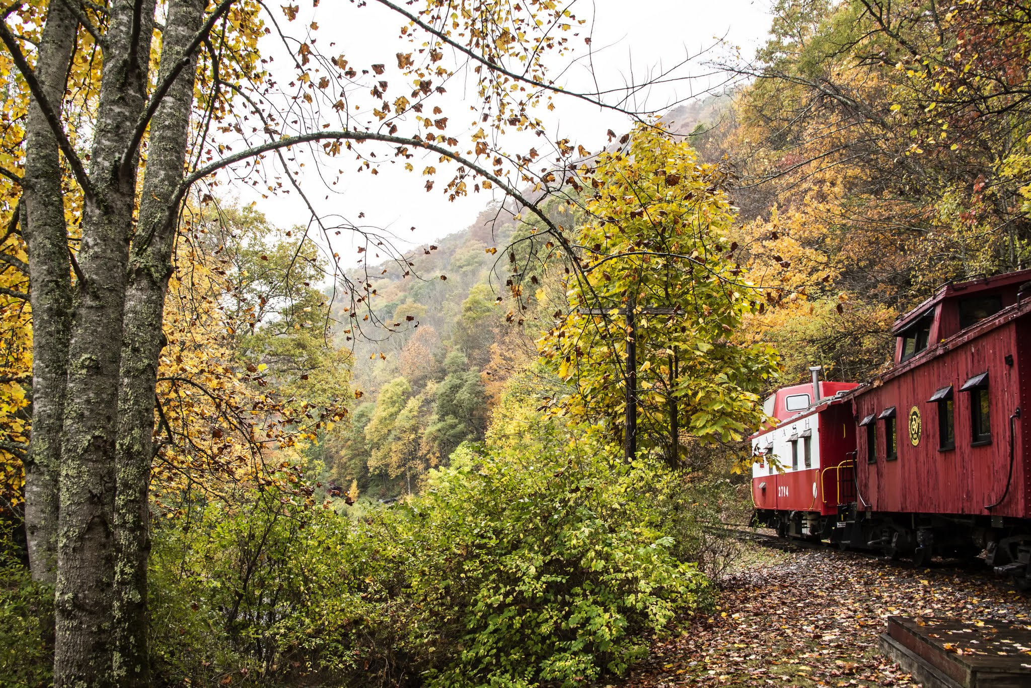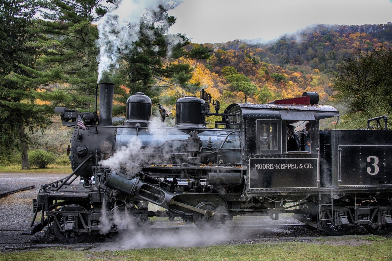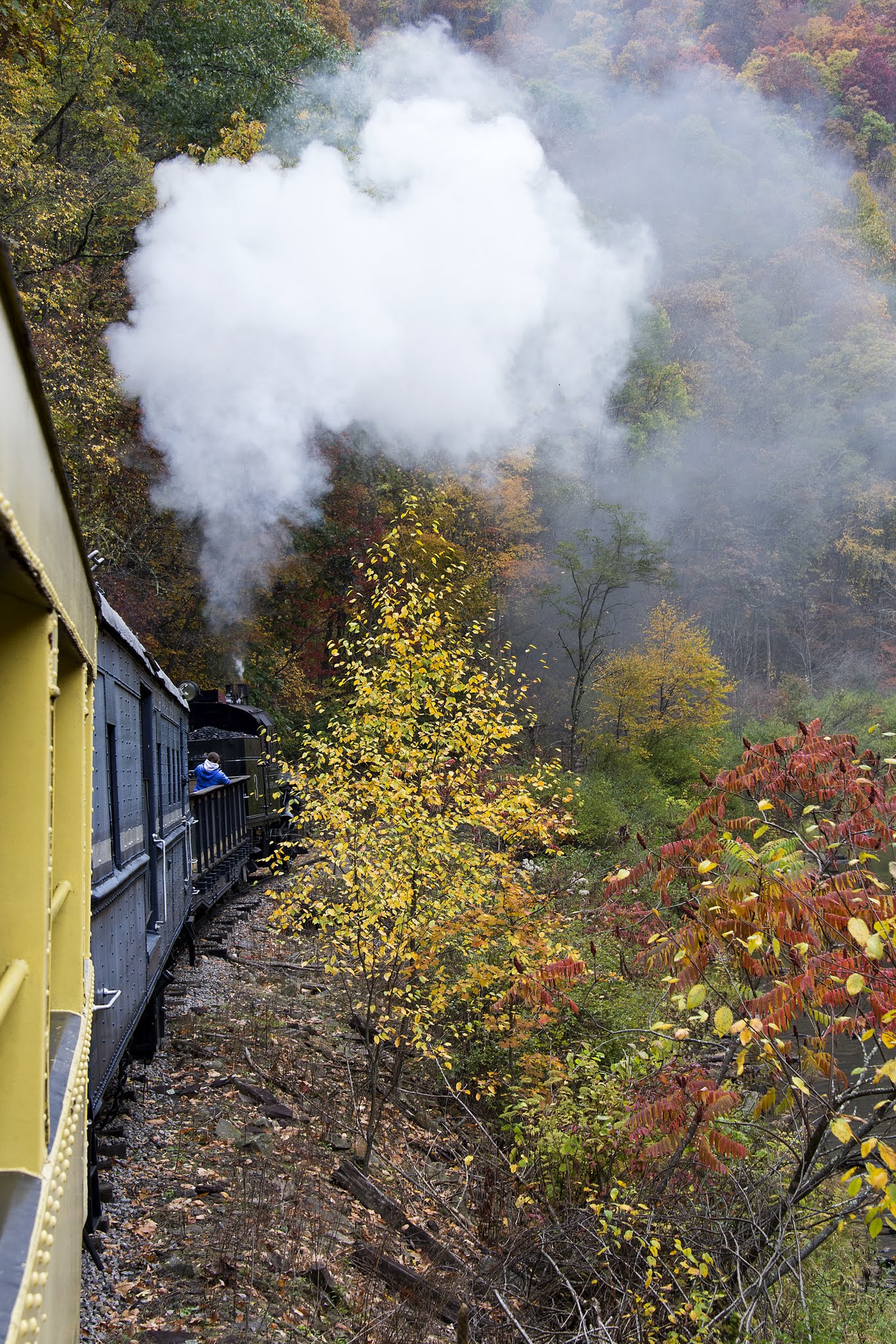 Durbin Rocket Train is powered by a rare steam locomotive. Built in 1910, the Old #3, is one of only three operating Climax geared logging locomotives in the world! The round trip train ride in Durbin covers 10.5 miles in 2 hours and offers many beautiful river and mountain views in the Monongahela National Forest as she puffs and whistles her way along Greenbrier River. There are different authentic 1920 cars behind the locomotive, an open car w/o roof, an enclosed car with heater, an open car with roof and a caboose at the end. I opted for the open car with roof so I could enjoy and photograph the view with some weather protection. However, I moved around the entire train quite a bit to photograph from different locations. The scenery of Greenbrier River was beautiful with full fall foliage colors.
