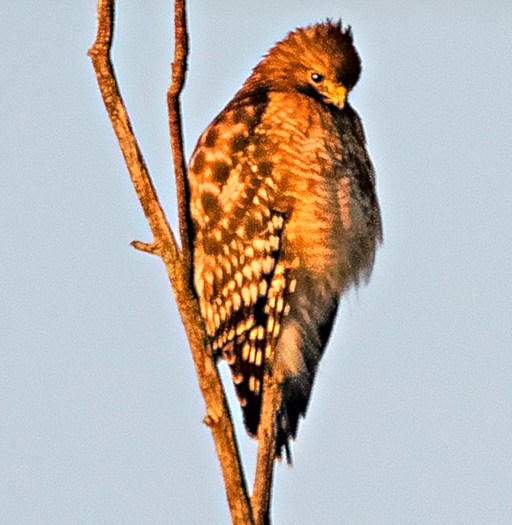 It was 8 degrees (-13 degrees C.) when I woke up this morning and there was the “resident” red-shouldered hawk perching on the top of tree branch under the beautiful golden morning light. How could anyone resist in capturing the scene!