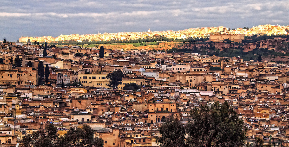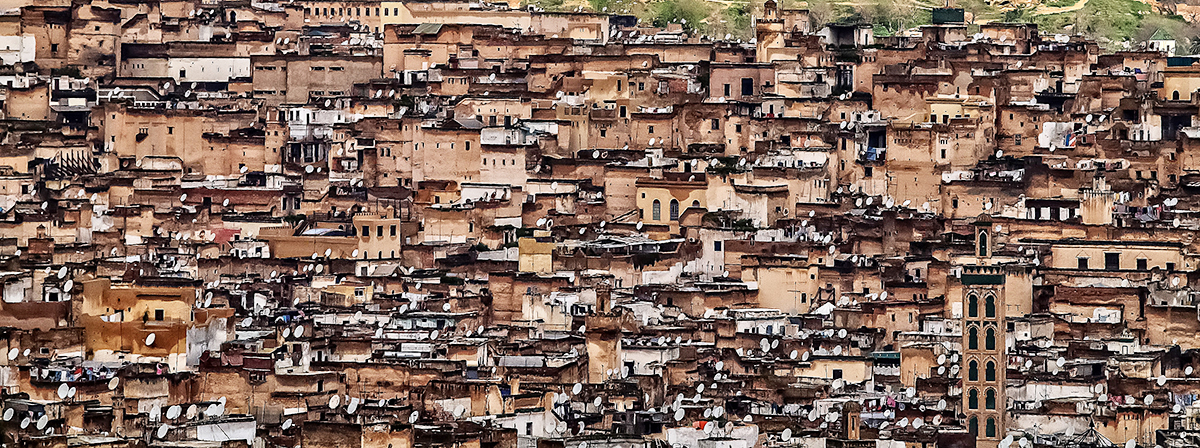 This is a panoramic view of the Medina of Fez, Morocco as seen from the highway surrounding the city. It was taken in late afternoon with beautiful soft light shining on the new and old towns (Medina). I was also fascinated by array of satellite TV dishes on top of all houses of Medina.