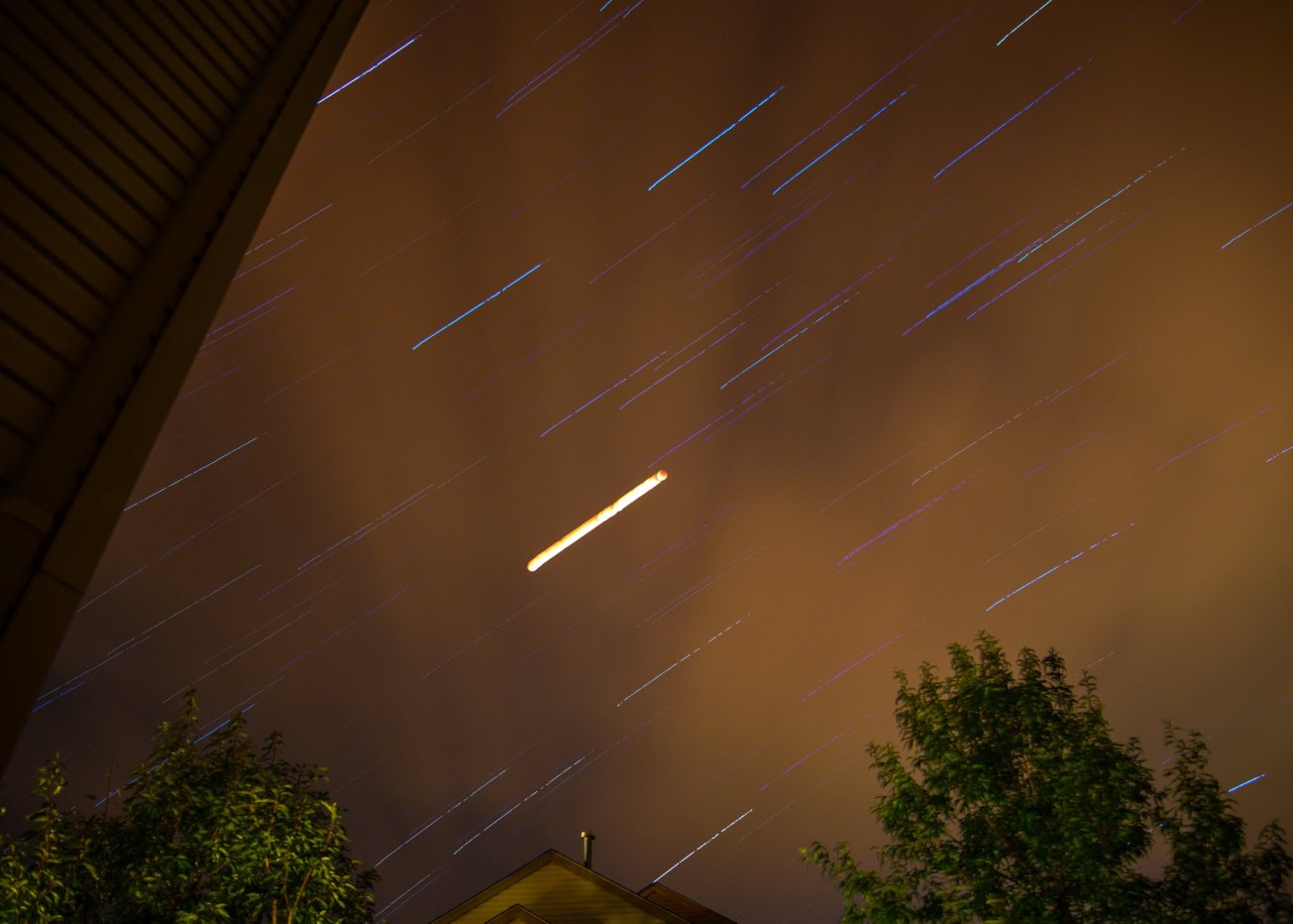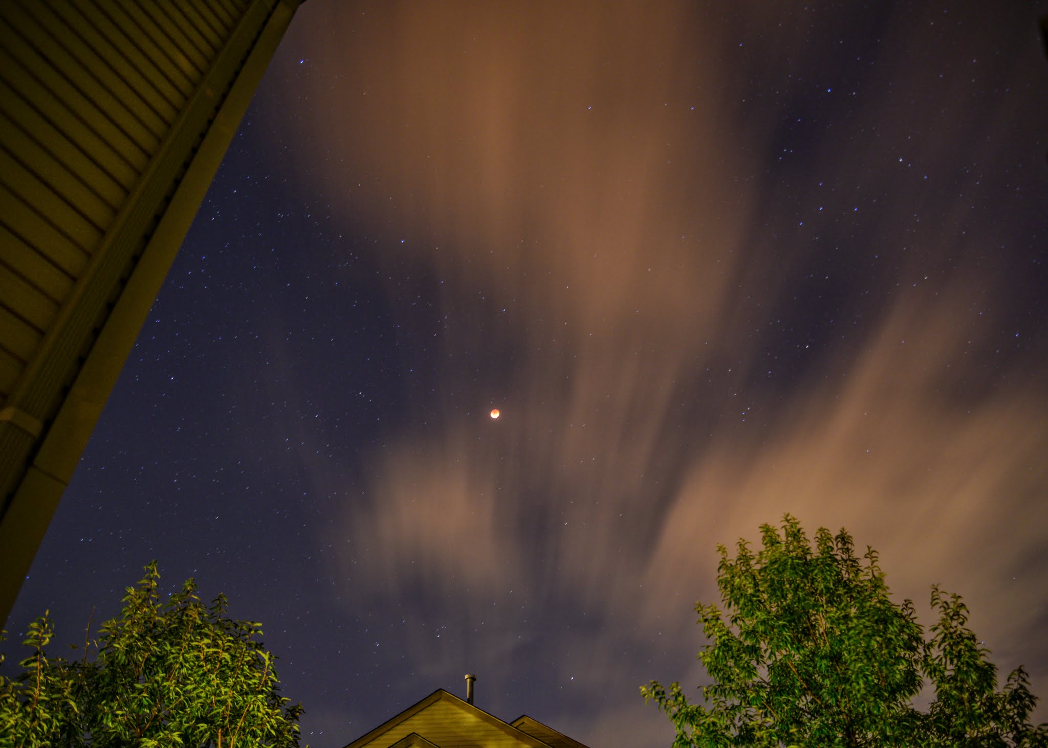 During the total lunar eclipse period from 10:11 pm through 11:23 pm on September 27, 2015, the sky was dark without the moonlight and there were plenty of stars in the sky so I quickly grabbed my other camera and set up to take star and moon trails for 40 minutes until all the stars began to fade when the moonlight re-appeared. The result was surprisingly interesting. As you may guess the bright thick trail in the middle of image was the moon movement in 40 minutes. However, the more amazing pictures were the individual shots with camera setting of f/3.5, ISO=400 and speed of 30 sec. (for regular interval shot of star trails) that showed the moon as a bright spot and cloud in dancing motion.