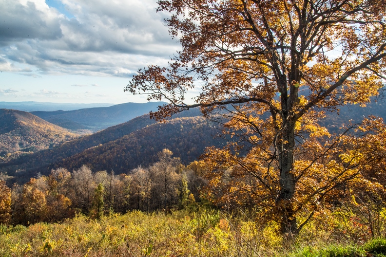 I am in the middle of a late autumn foliage tour of Shenandoah, the Great Smoky and Blue Ridge Mountains. My first destination was the driving through Skyline Drive of the Shenandoah National Park and here is a image of a tree showing the golden colors under the late afternoon sun light.