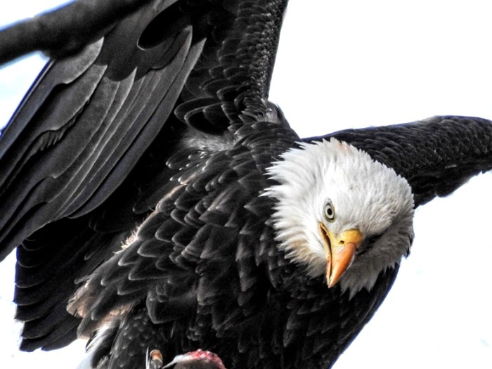 A fierce look of a bald eagle guarding and consuming his kill on a tree.