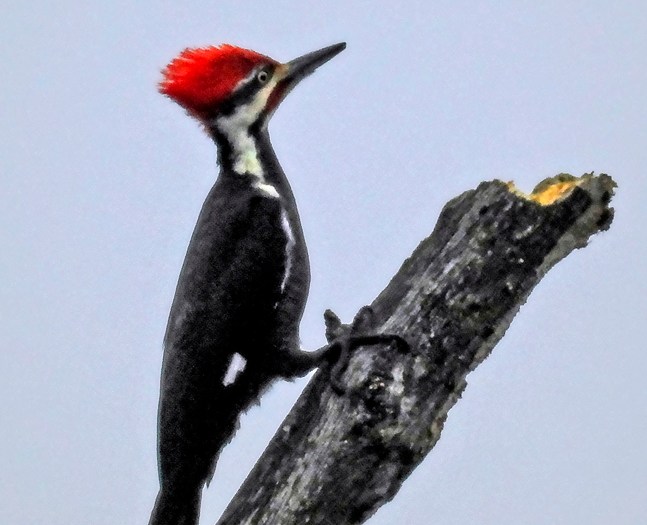 Talking about being lucky, I happened to look out from our dining room with my camera in hand yesterday and saw this rare and beautiful pileated woodpecker perching on a dead branch in my backyard woods. I quickly snapped 3-4 pictures before he/she flew away.