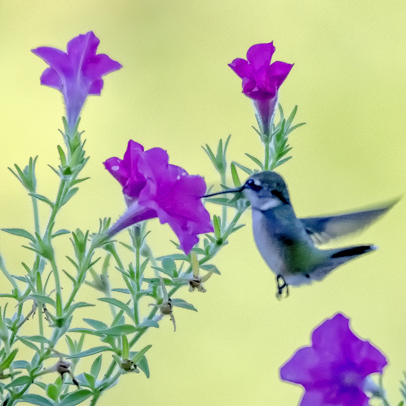 I was delighted to see a hummingbird coming for the potted flower on my deck this morning. I had to set the camera at high ISO because of the poor lighting condition thereby introducing some noise on the image.