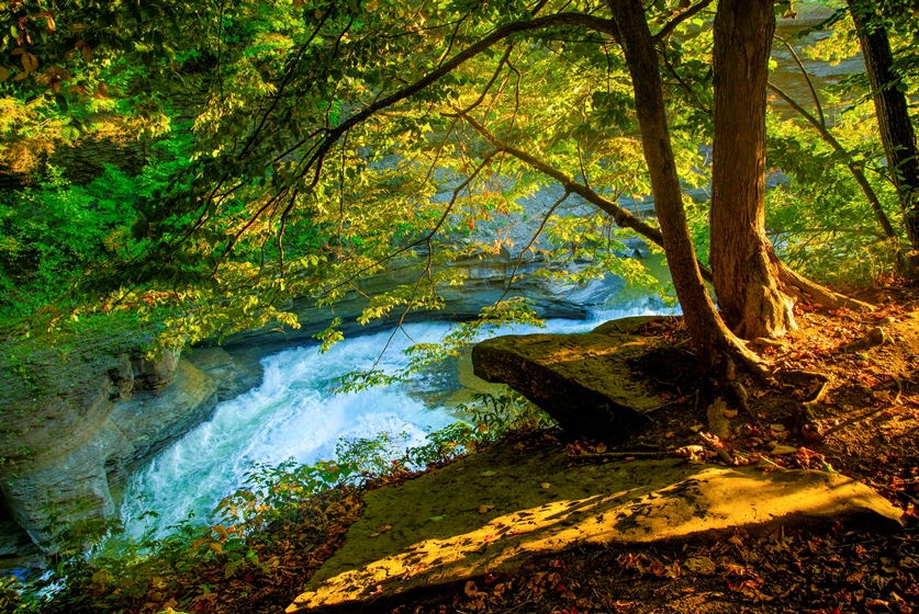 Backlight is where the light is shining towards the camera lens. It is a bit tricky but challenging to photograph. I have taken pictures of shadows and silhouettes this way in the past. During my recent trip to Letchworth State Park in western part of Finger Lakes region in New York State, I saw some beautiful foliage scenes in late afternoon when the sun was shining on the leaves making them almost translucent in front of my camera. I just could not pass them up.