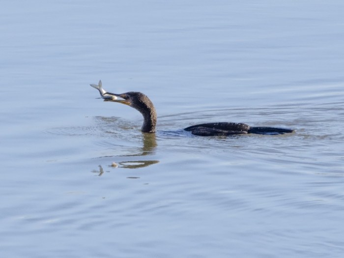 While shooting bald eagles below Conowingo Dam last Friday, I noticed a cormorant dived and caught a big fish. After struggling for few minutes to swallow the whole fish, he(she) took off.