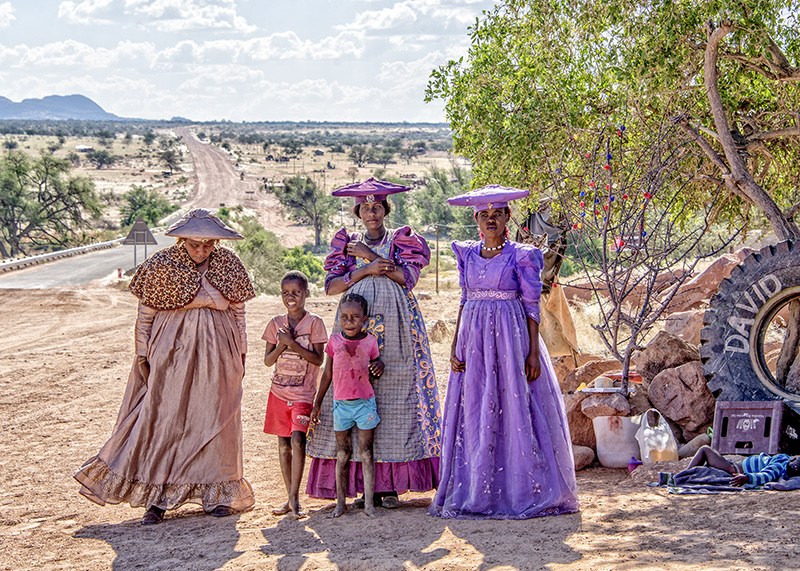 On the way to Damaraland from Swakopmund, we stopped by a roadside market operated by Herero women who wore very distinctive long, flowing Victorian gowns and headdresses. Multiple layers of petticoats made from very long colorful fabric give a voluminous look. It is their traditional dress since introduced by the missionaries in the 1800’s.  Herero is the third largest ethnic group in Namibia with 7% of total population.