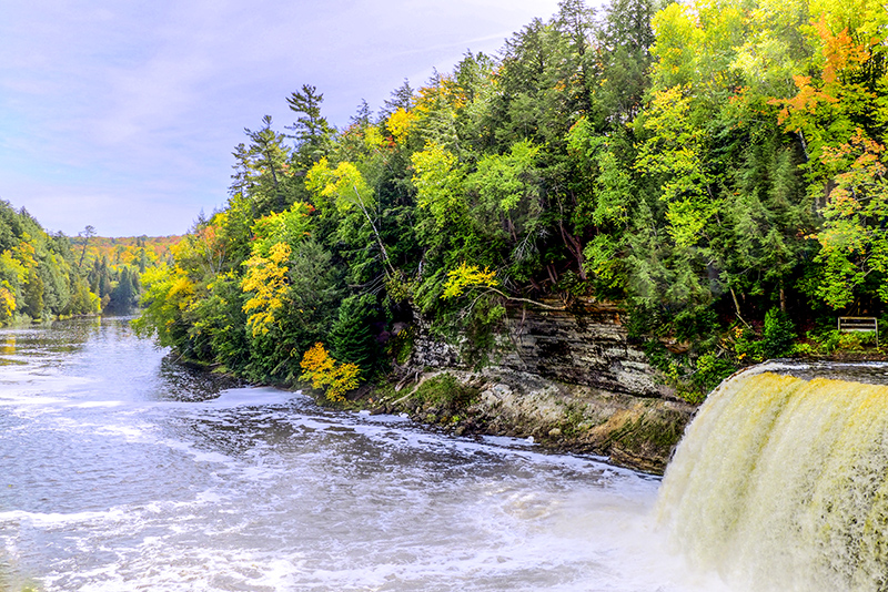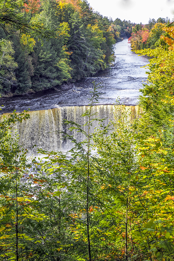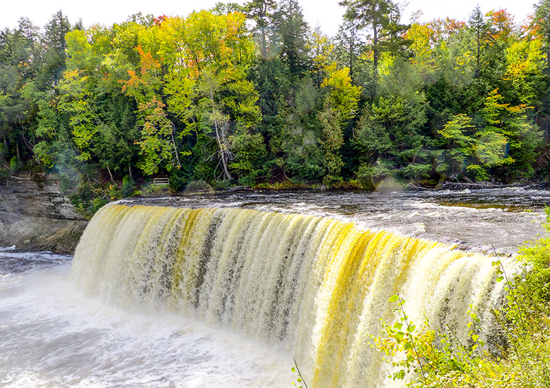 We visited Tahquamenon Upper Falls on the way to Sault Ste. Marie from Munising. The upper falls are more than 200 feet across and drop approximately 48 feet. The water is notably brown in color because of tannins that are leached from the cedar swamps which the river drains, so the falls has been nicknamed as Root Beer Falls. It is a beautiful falls especially surrounding with autumn colors.