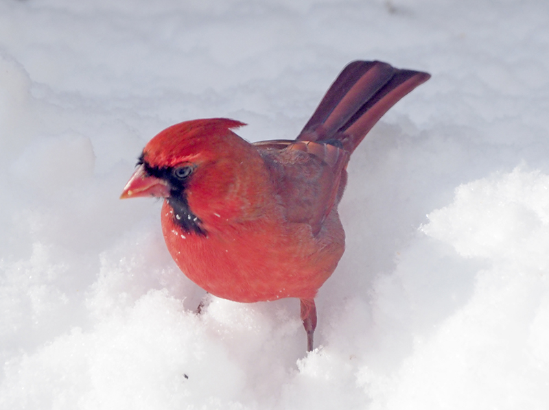 We got six inches of snow yesterday. I couldn’t wait to see cardinals visiting my bird feeder on the deck, especially the male one with bright red feathers in contrast to the white snow – just beautiful!
