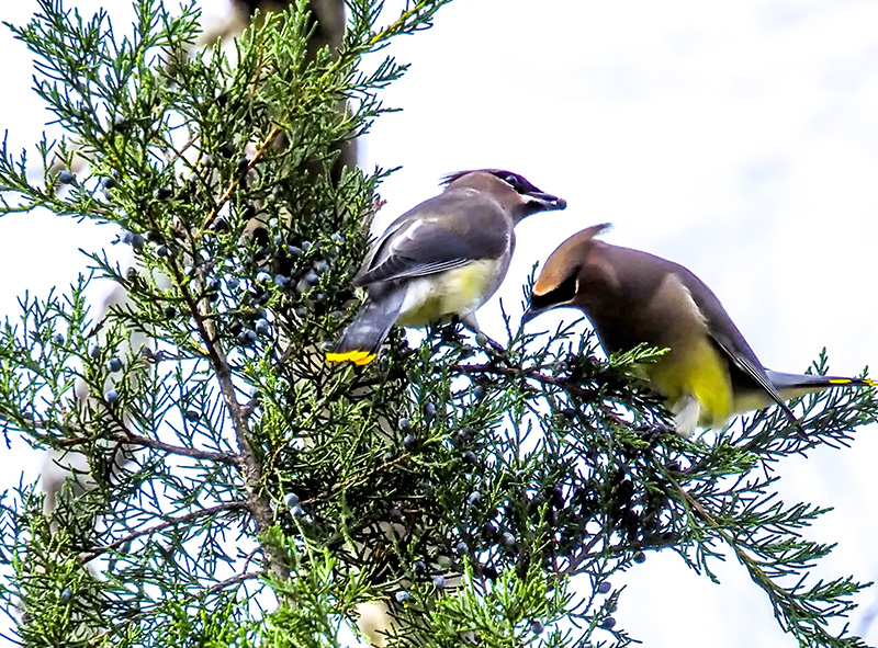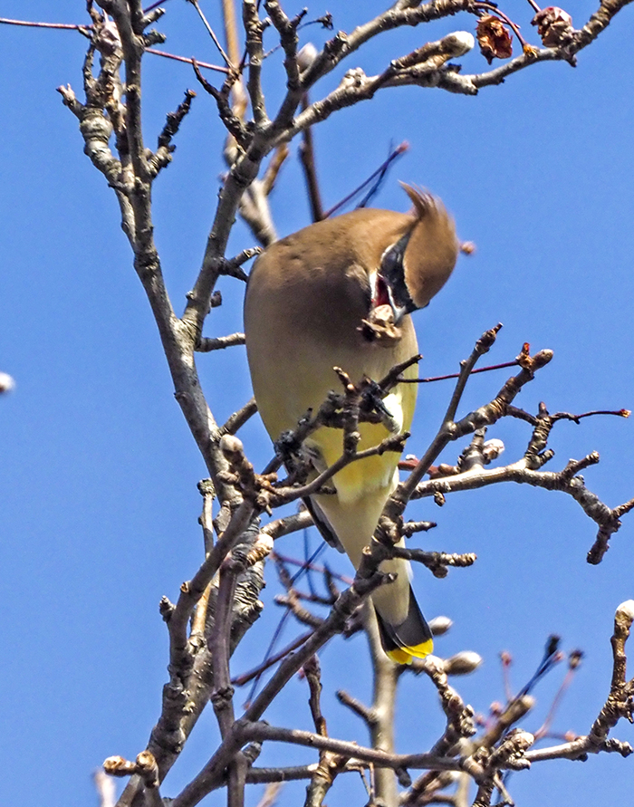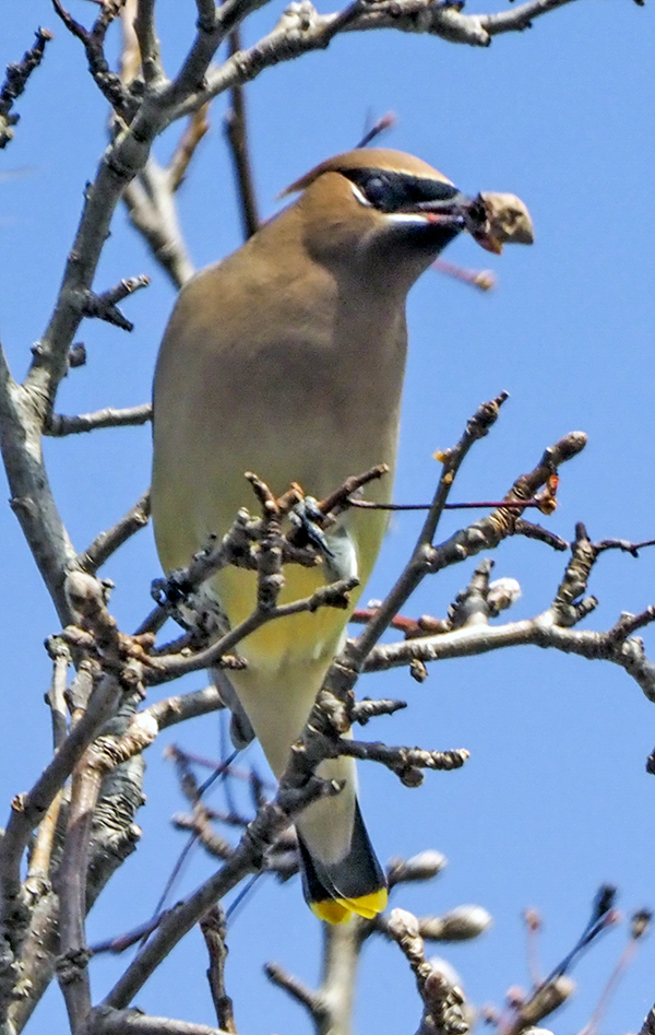 There was one Cedar Waxwing among at least a dozen of American Robins that visited my front yard tree to pick the fruits other day. That’s the first time I saw cedar waxwing around our house. Cedar waxwing loves the berries. The first time I saw this lovely bird was at C&O Canal in the Great Falls Park in 2020.