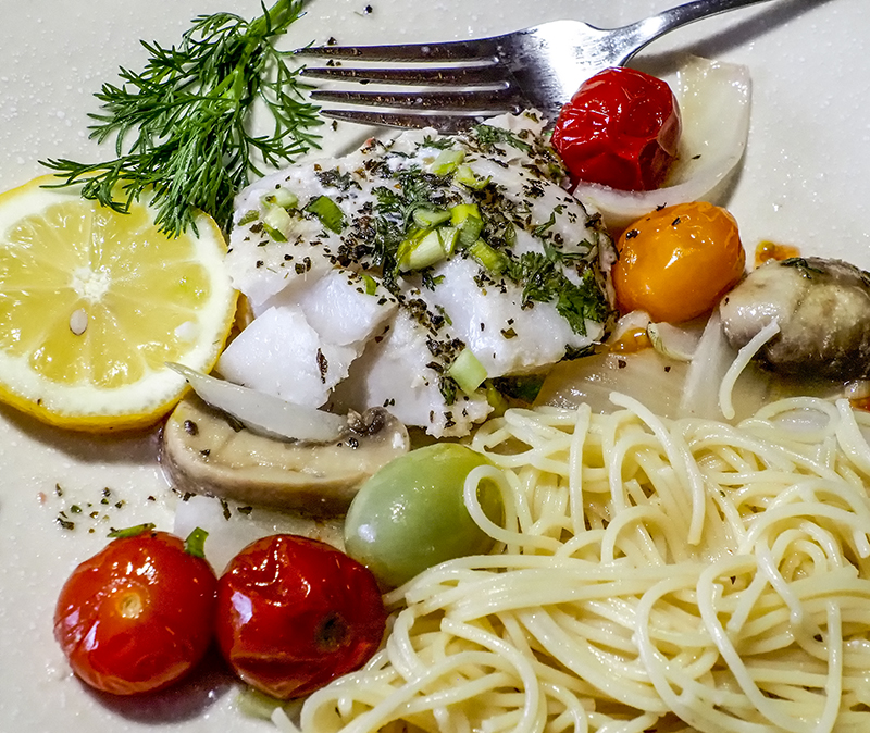 Baked Cod with cherry tomatoes, onion, mushrooms and lots of spices such as garlic, basil, parsley, chives, etc. I love baked cherry tomatoes with burst sweetness when bit.