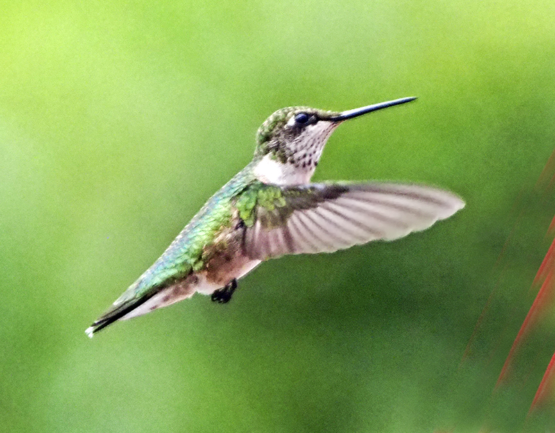 I have taken more pictures of hummingbirds visiting my feeder on the deck. I undestand hummingbird is the only kind of bird that can fly backward and I got two of them to share. The last three sequential images show the take off scene of a hummer – luckily the head was relatively sharp and clear with very fuzzy wings that could be flapping up to 200 beats per second.