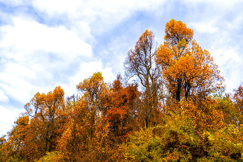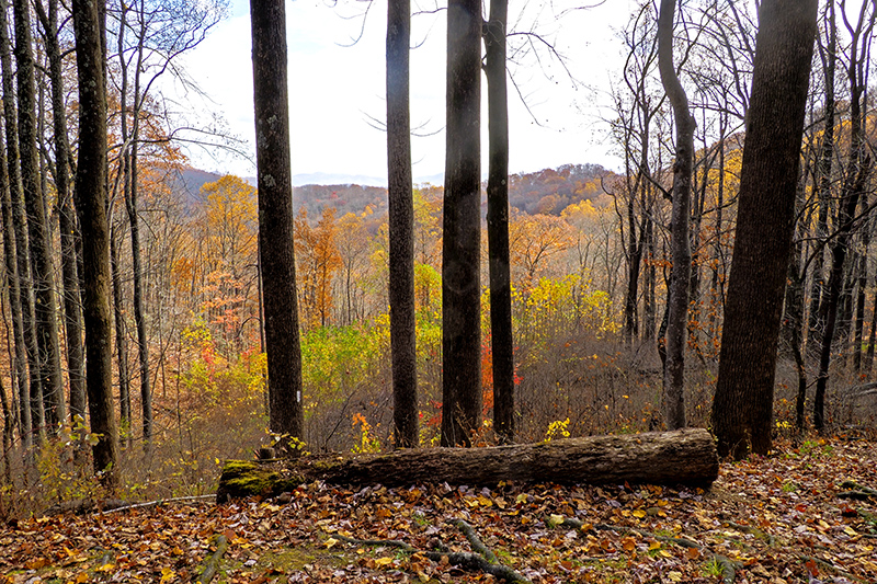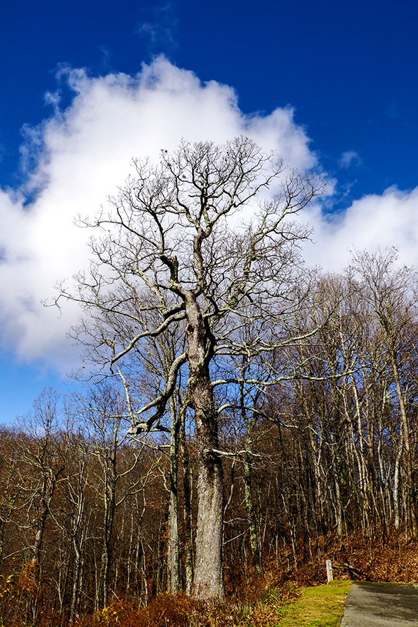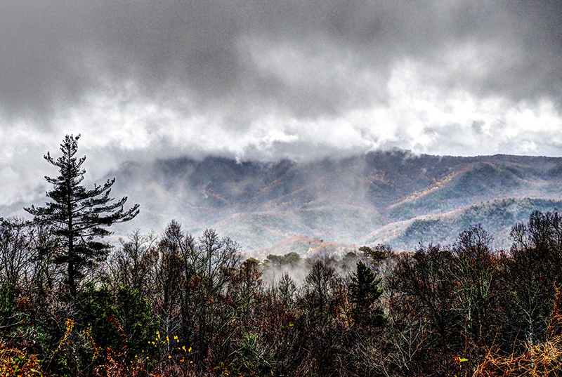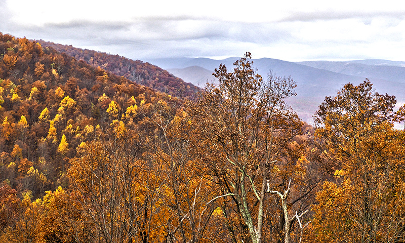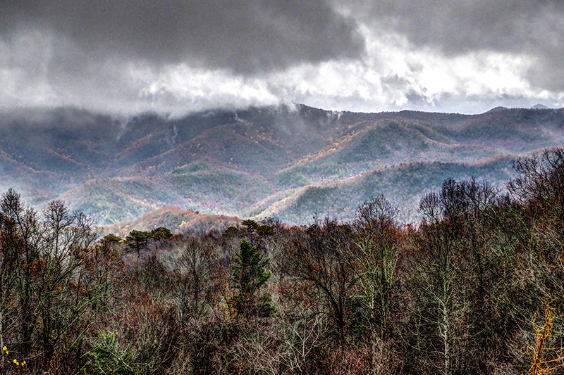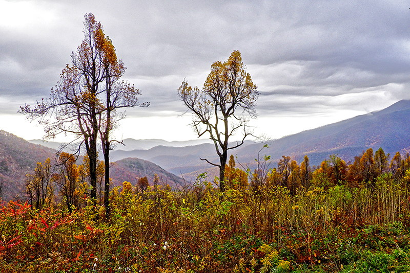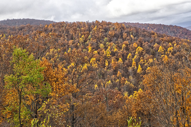 We toured the entire Blue Ridge Parkway from Waynesboro, Virginia to Oconaluftee, North Carolina in three days after tour of Skyline Drive. We had a very good day on the first day and viewed and photographed some nice fall color scenes (whatever was left as the peak had passed). On the second day it rained hard with strong wind and that left all the tree bare! It was tough driving as the visibility was very poor in some sections of the Parkway. We did get halfway decent weather during the last day, but the colors were all but gone.